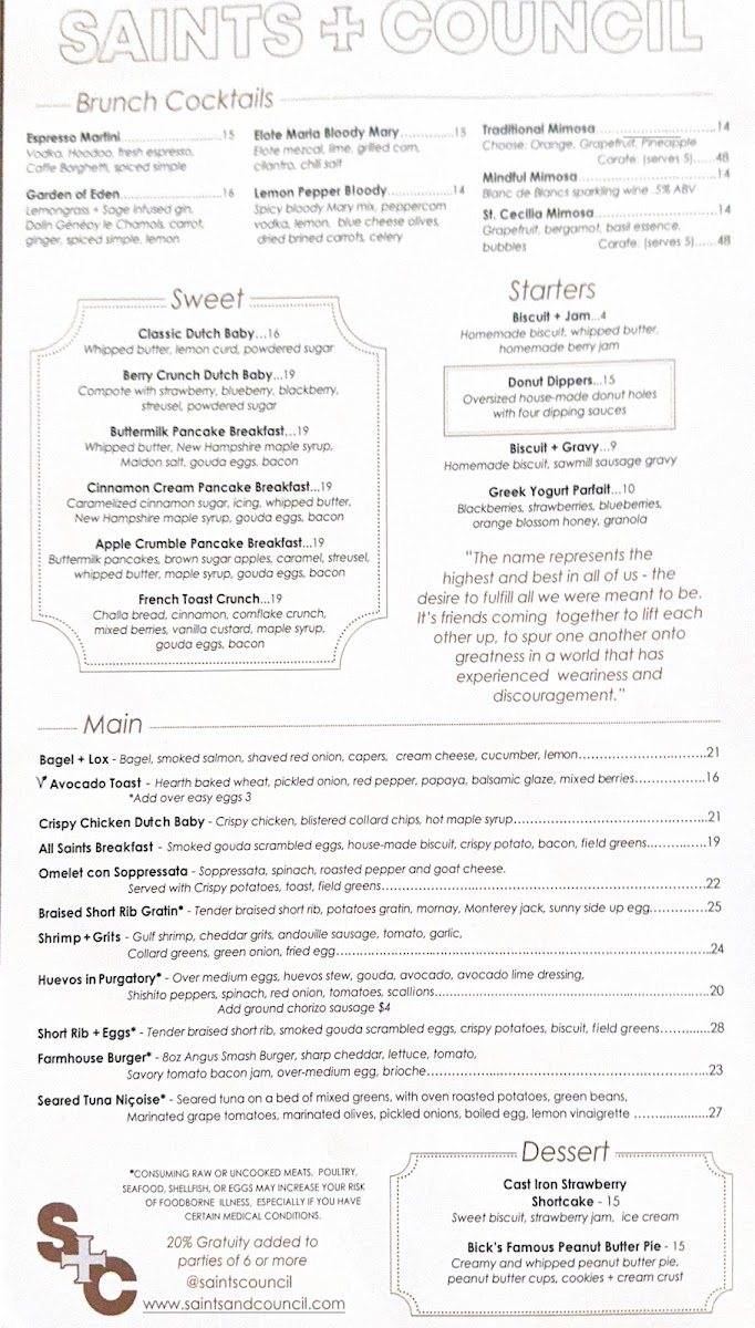 So, gather your friends and family, and prepare to be enchanted by the exceptional offerings at Saints + Council. Whether you're seeking a cozy dinner or a lively brunch, this restaurant effortlessly hits all the right notes. Don't miss the chance to savor a culinary adventure that promises to keep you coming back for more.