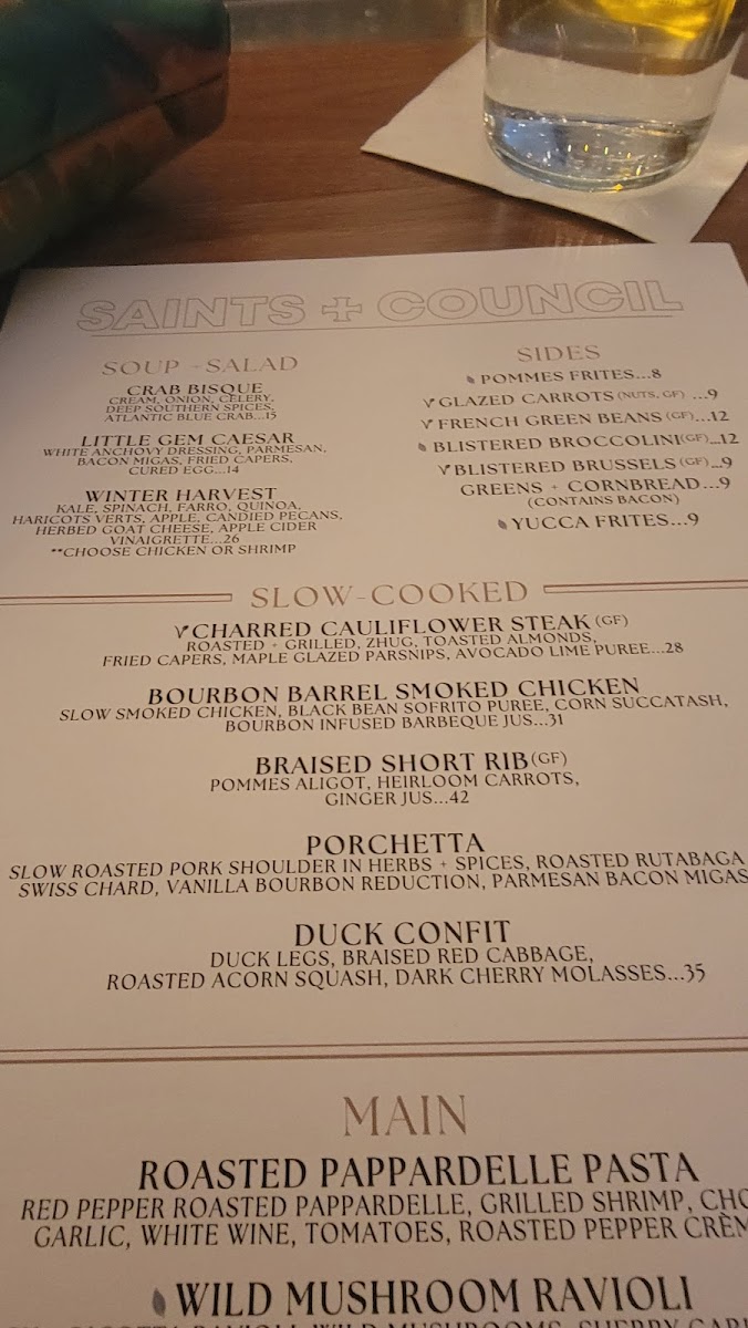The menu at Saints + Council is a celebration of fresh, seasonal ingredients that reflect the changing tides of the culinary landscape. From mouthwatering appetizers like baked crab dip and fried green tomatoes to main courses that showcase the chef's creativity, every dish promises to tantalize your taste buds. The Wild Caught Branzino offers a delicate flavor profile, while the braised short ribs melt in your mouth, immersing you in a savory delight that guests rave about.